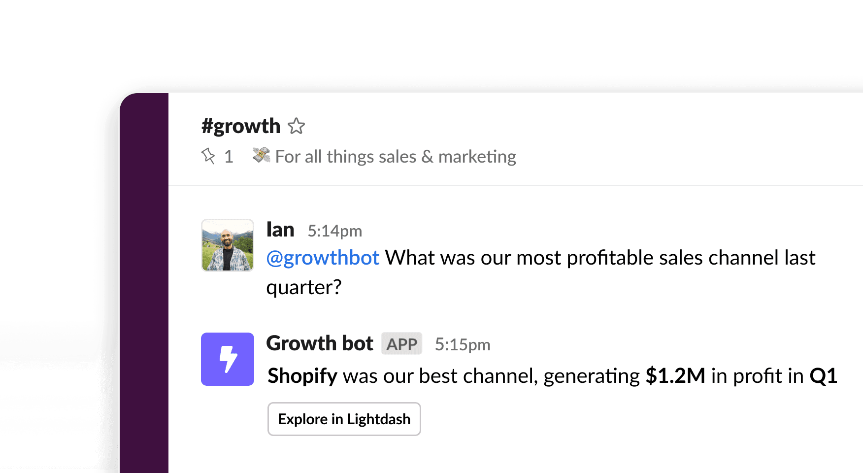 Ask questions directly in Lightdash or Slack and get the answers you need, whether it’s a chart, a table, or plain-language insight. Follow up, dig deeper, or pivot your query without switching tools.